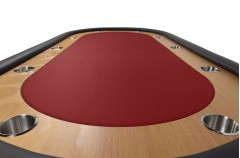 Table de poker 10 joueurs avec repose-coudes en simili-cuir noir, racetrack en bois mélaminé et tapis en microfibre rouge.